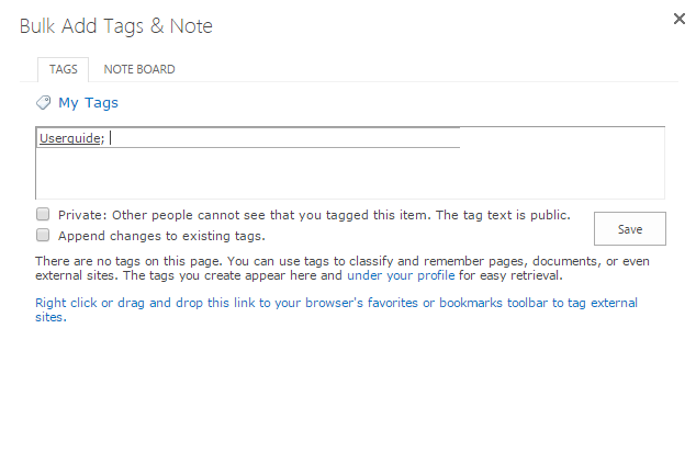Here, we input “Userguide” as the tag, click Save, then the tag that will be applied to all of the selected documents.