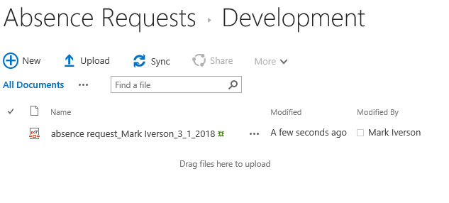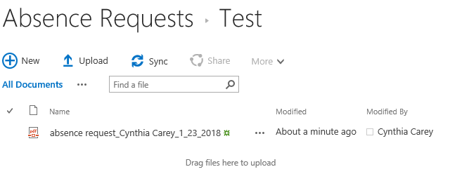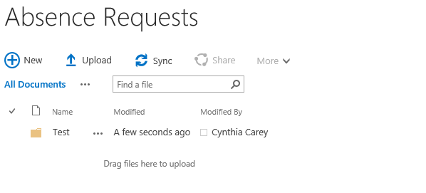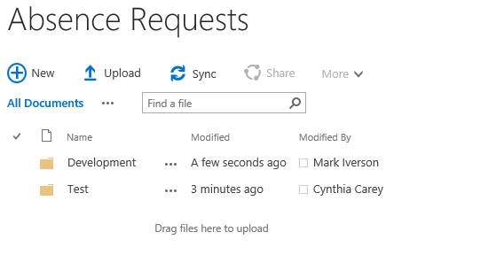 Check Absence Requests document library, you will find that a folder named as Development is created in the library.