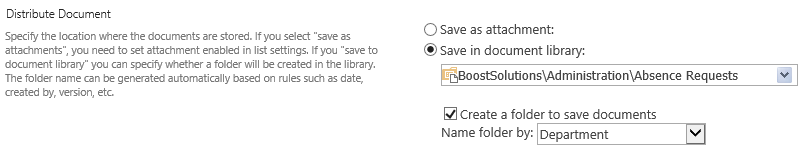 In Distribute Document section, select Save as attachment option and select Absence Requests from the drop-down list as following.