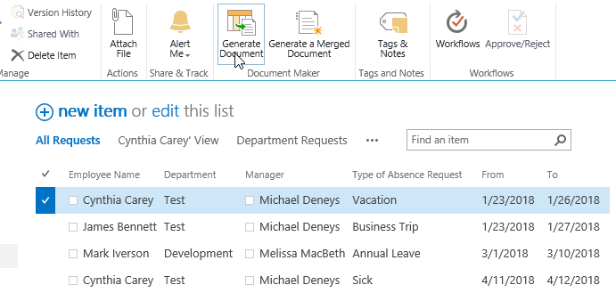 Access Absence Request List as user Cynthia Carey, select one item (Cynthia Carey). Under ITEMS tab and click Generate Document in Document Maker group.