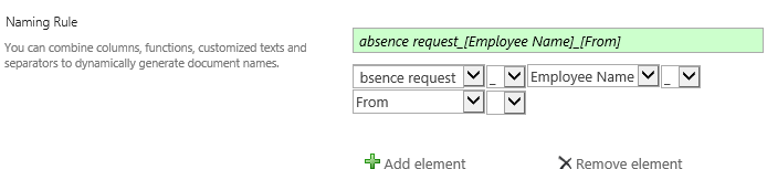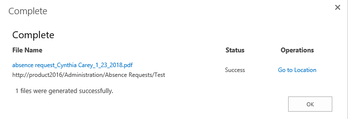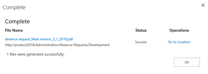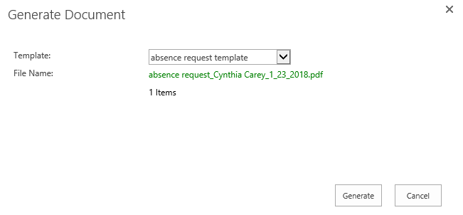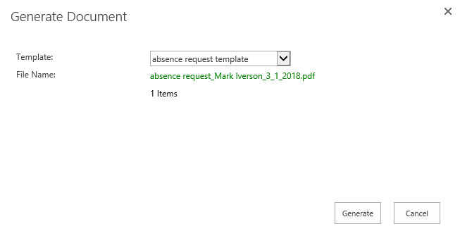 When Generate Document dialog appears, in Template section, select absence request template. In File Name section, you will see that the file name is generated based on the rule as following.