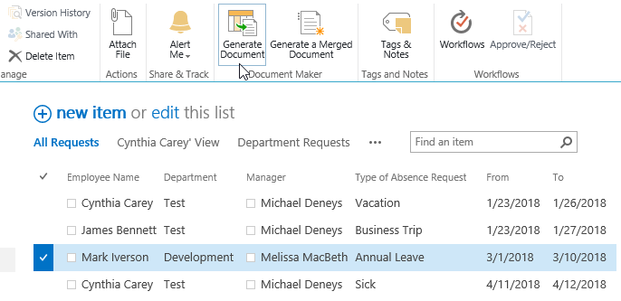 Access Absence Request List as user Mark Iverson, select one item (Mark Iverson). Under ITEMS tab and click Generate Document in Document Maker group.