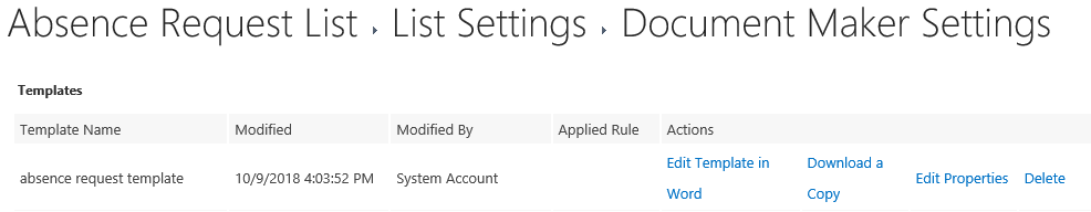 In the Document Maker Settings page, upload absence request template in the Document Maker settings page as following.