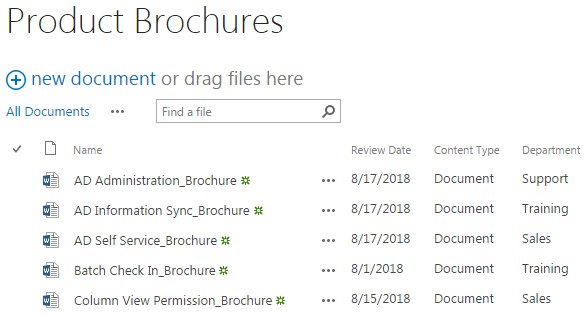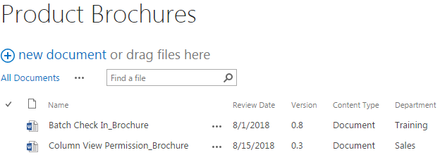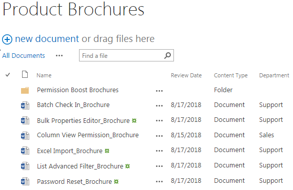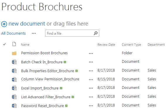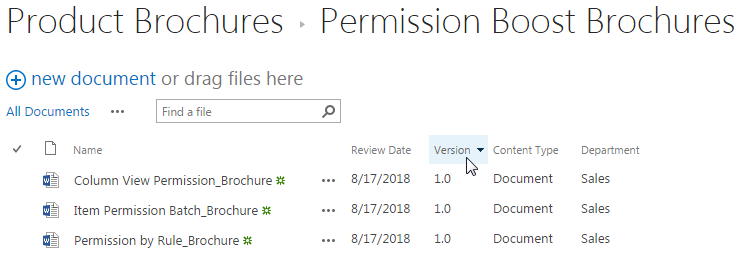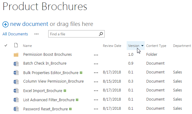 The other four single documents, the Bulk Properties Editor_Brochure, the Excel Import_Brochure, the List Advanced Filter_Brochure and the Password Reset_Brochure have been extracted and uploaded to the document library with version 0.1, and the Department column has been assigned by the default value Sales. There is no version control for folders, so the version for Permission Boost_Brochures will always be 1.0, and the documents within the folder will be start with version 1.0 as well.