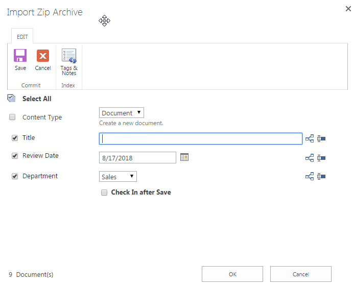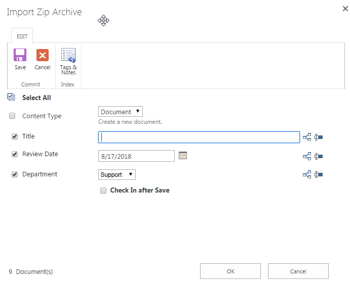 The Bulk Edit page pops up after clicking the Index contents after upload in the Import Zip Archive page, which allows you to Check In All Documents, Bulk Edit All Documents and Group Edit All Documents Individually while importing the Zip file.