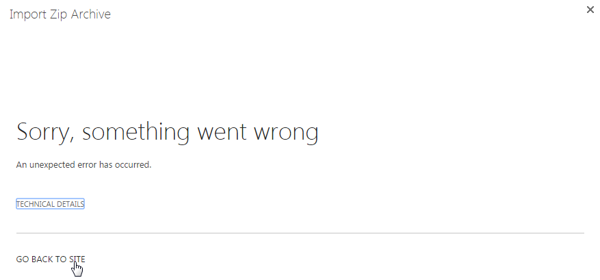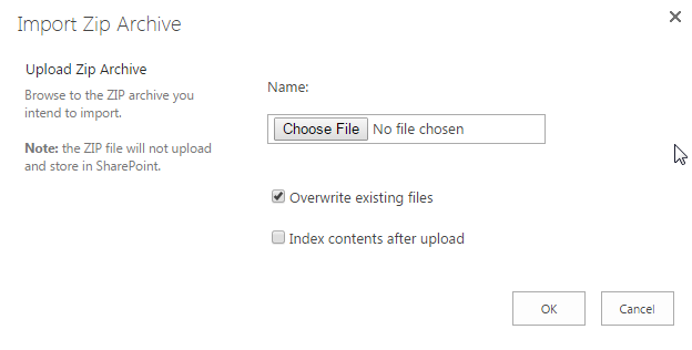 Then, the Import Zip Archive window will pop up. In the Import Zip Archive dialog, click Choose File to browse to the ZIP archive you intend to import. Note that the ZIP file will not upload and store in SharePoint, only the files within the ZIP file will be extracted and uploaded to the document library.