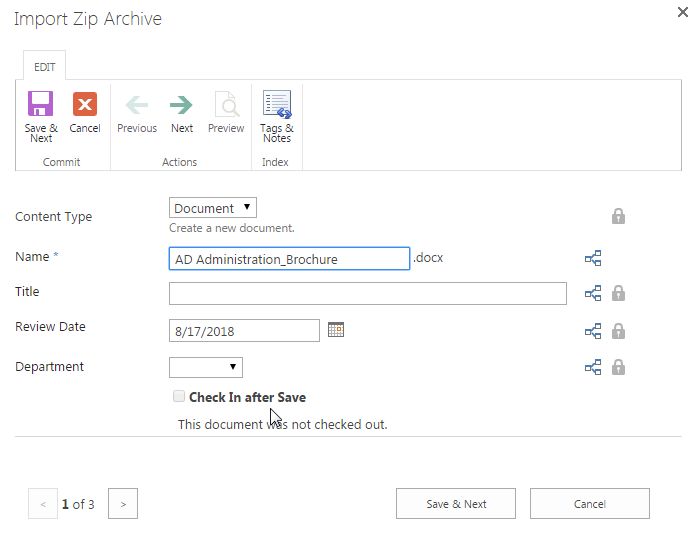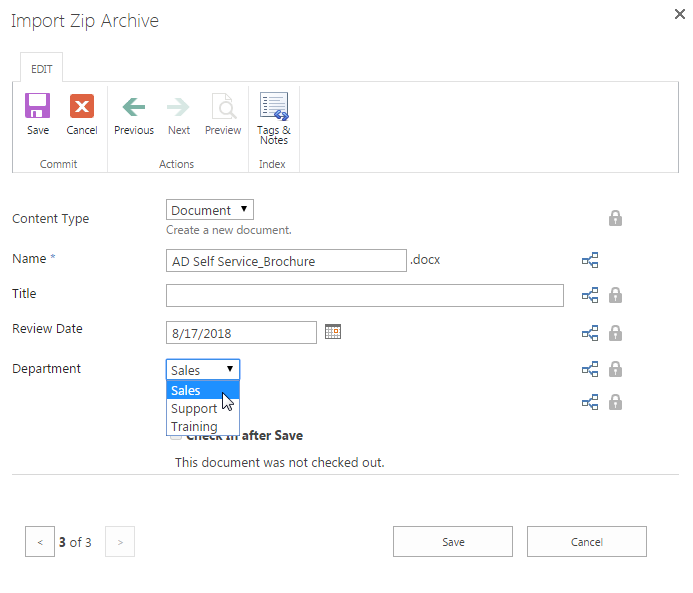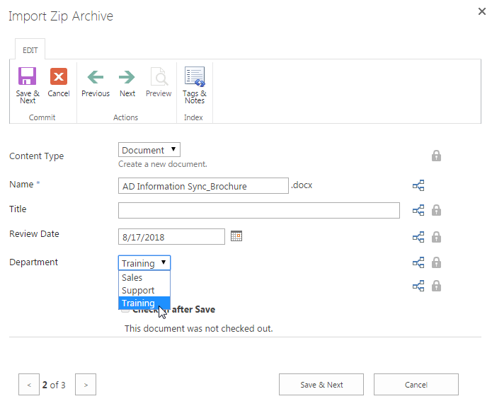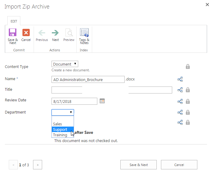 Here, let’s make modifications on the Department field for each document one by one. Keep other fields as default. Every time when finish the editing click Save & Next. When finish editing the last document click Save. Let’s change the Department value for AD Administration_Brochure to Support and click Save and Next.
