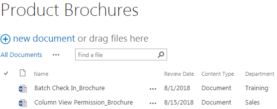 After a short loading process, you will find that all documents contained in the ZIP file Brochures 2013 have been extracted and uploaded to Product Brochures and the Review Date and Department fields for all documents have been bulk edited accordingly except the folder as shown below. The Batch Check In_Brochure has been overwritten and the Column View Permission_Brochure stays the same.