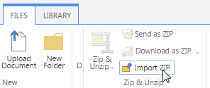 Go to FILES tab, in the Zip & Unzip group, click Import ZIP to import a ZIP archive and extract its content into this library.