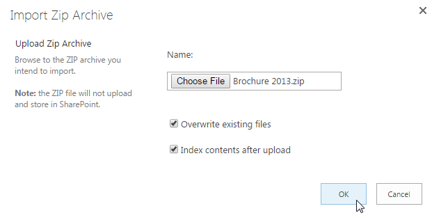 Here we select the ZIP file Brochures 2013 we prepared to import its content to Product Brochures . And let’s check Index contents after upload and click OK.