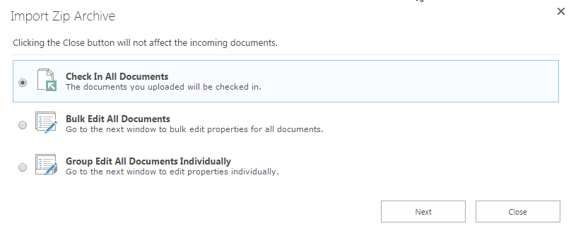 BoostSolutions’ Bulk Zip&Unzip enable users to import an ZIP archive and extract its content into a document library. The ZIP file will not upload and store in SharePoint. More than that, if with the help of BoostSolutions’ Bulk Properties Editor, besides import the content within a ZIP file to a document library, meanwhile, you can Bulk Check In, Bulk Edit Properties for All documents or Group Edit All documents’ Properties individually after import them.