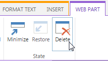 The second way is to click on the web part and you will see the WEB PART tab appear on the ribbon. Click on the tab and then click on Delete button in the State group.