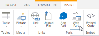 Choose INSERT tab and click on Web Part button in the Parts group.