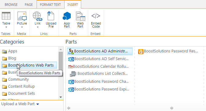 After clicking the Categories list will appear under the ribbon. Choose the BoostSolutions Web Parts in the Categories list. And then, you will see the installed BoostSolutions web parts in the Parts group as following.