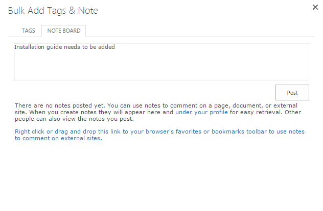 Here we input “Installation guide needs to be added” as the note. Then click Post, the edited Note will be applied to all of the selected documents.