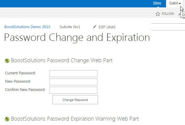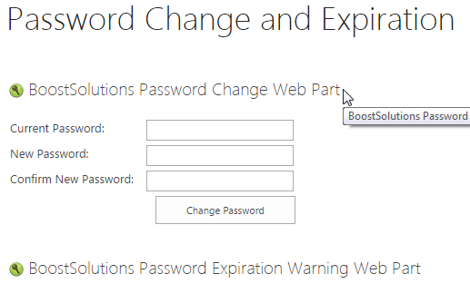 BoostSolutions’ Password Change & Expiration allows users to change their own passwords from SharePoint without administrator intervention. This web part also has sending expiration notification emails to warn users before their passwords expire, sending confirmation emails after users have successfully changed their passwords and other features. In this article we will demonstrate how to change the password on a SharePoint site. There are two ways to do it.