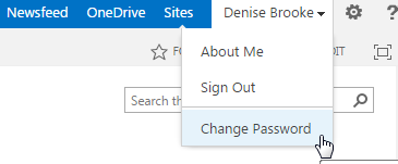Now let’s try another way to change the password of the user. This time log in as Denise Brooke. Click on the name in the upper right corner of the site to open the personal menu. Then click on Change Password.