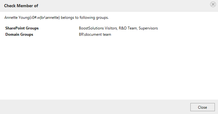 When Check Member of dialog appears, you will see that all SharePoint and domains groups that user Annette Young belongs will be listed as following..