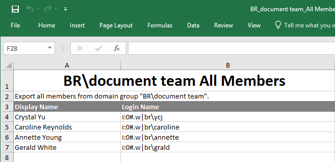 Then open the saved Excel file, you will find that the members of this group are listed as following.