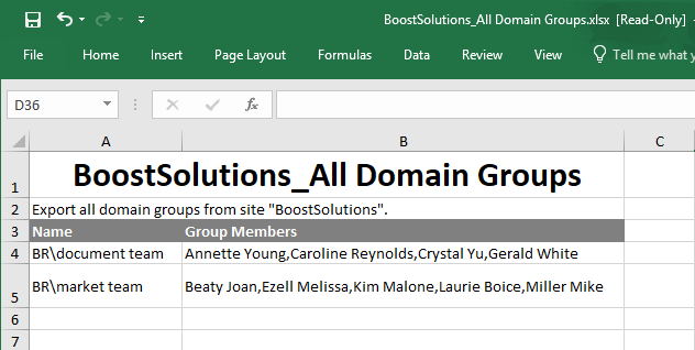 Then open the saved Excel file, you will find that domain groups and their members as following.