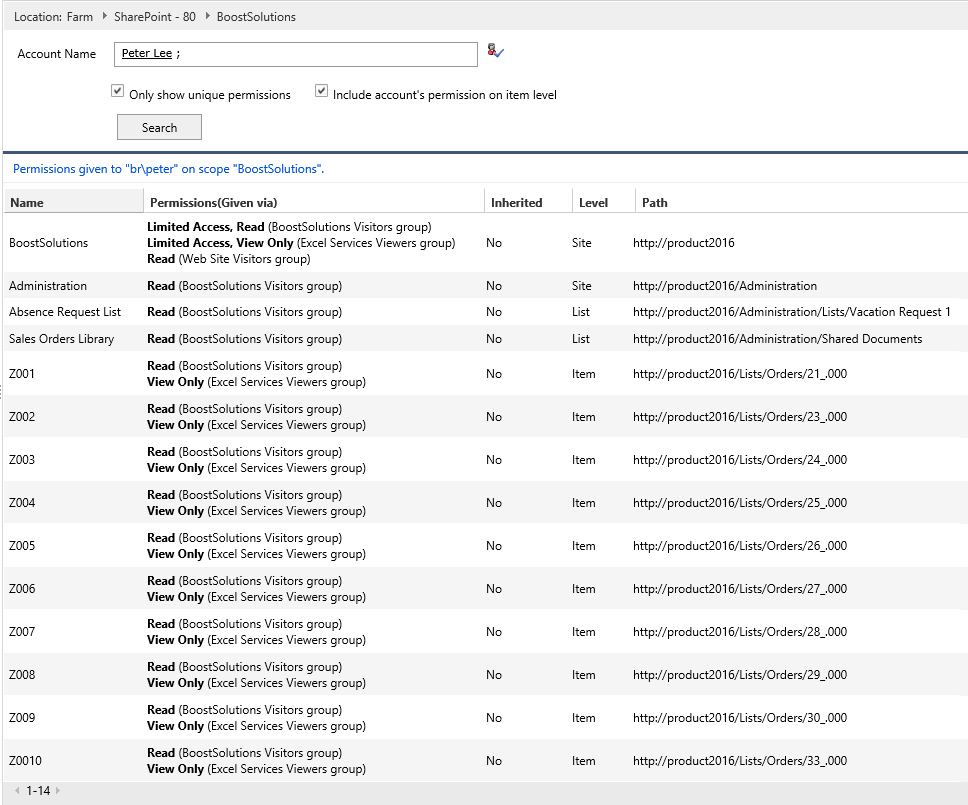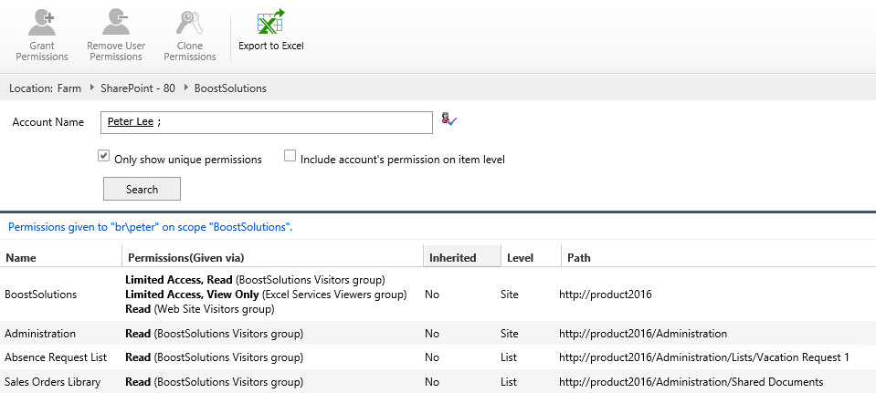 BoostSolutions’ Permission Manager enables you to search a specific user’s permissions at site, list, folder or item levels. You can also export search results as an excel file for reporting and managing user permissions directly based on search results.