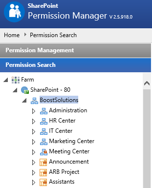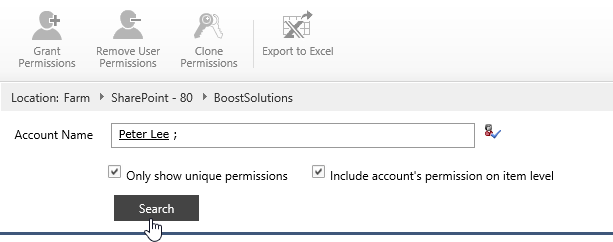 Navigate to the Permission Search, click site collection – BoostSolutions.