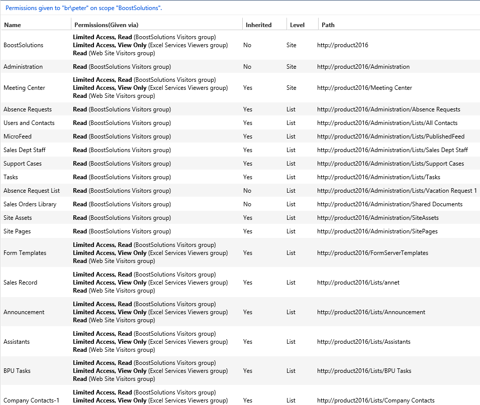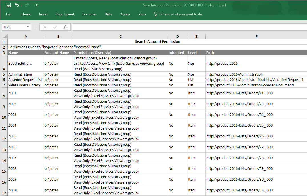 Then open the saved Excel file, you will find that Peter’s permissions are listed as following.