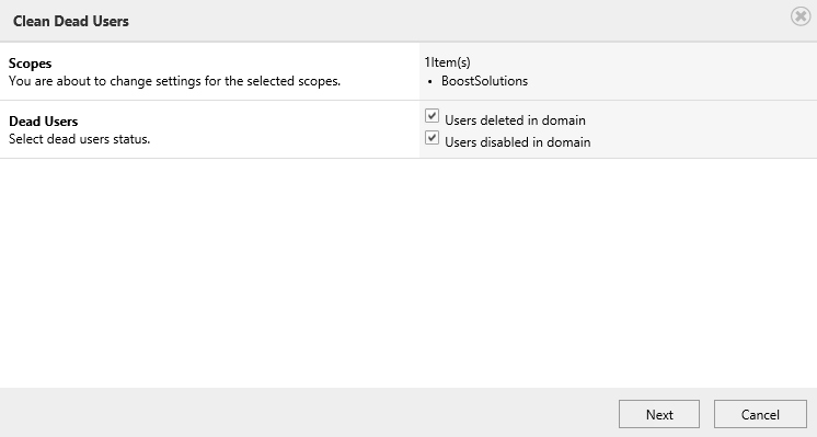 When the Clean Dead Users dialog appears, you will see there is one site collection in Scopes section.