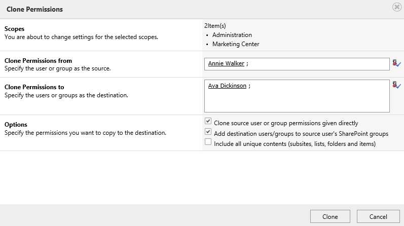 In Options section, select Clone source user or group permissions given directly and Add destination users/groups to source user’s SharePoint groups options.