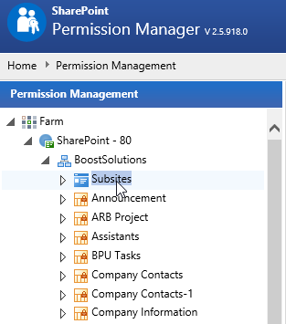 Navigate to Permission Management, and click Subsites under a site collection node.