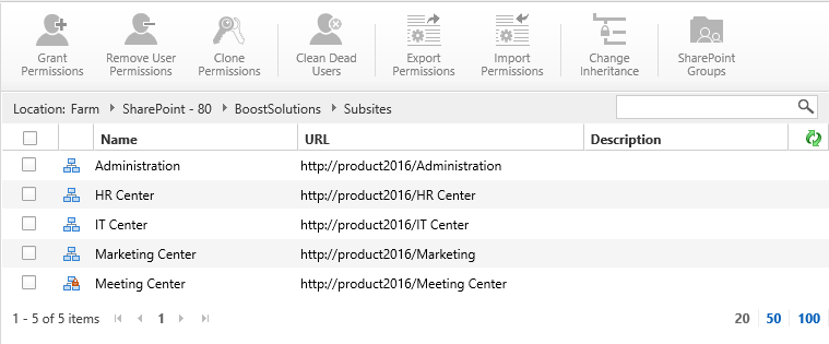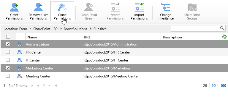 Select 2 sub sites - Administration and Marketing Center and click Clone Permissions.