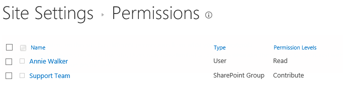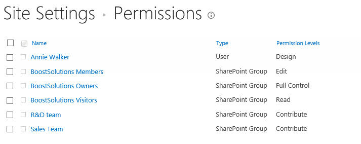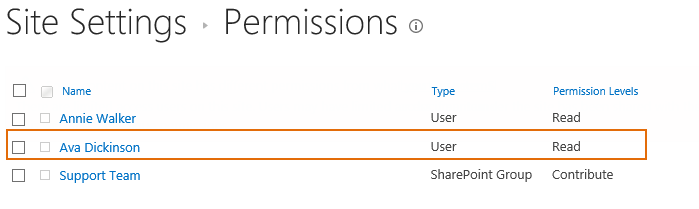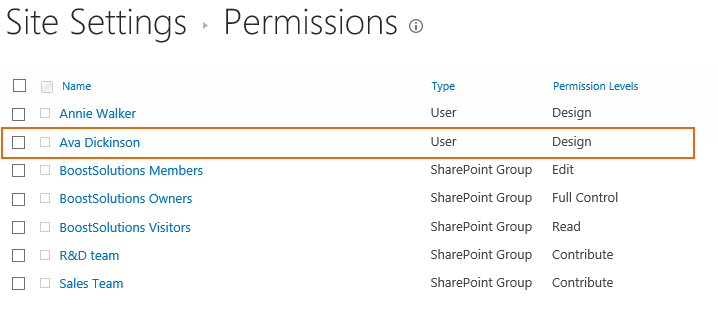 Enter one site – Administration and check the permission settings. You will find that the user Ava Dickinson has been assigned to Design permission level as same as user Annie Walker.