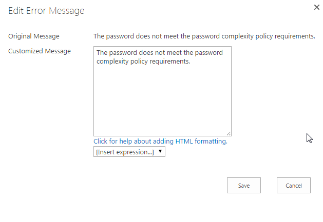 Now let’s repeat the steps 3,4,5,6. Make changes to the The password does not meet the password complexity policy requirements error message. Again click on Edit… button in front of the error message to customize it.