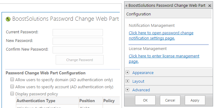 Following Password Change Web Part Configuration table will appear under the web part after clicking on the option.