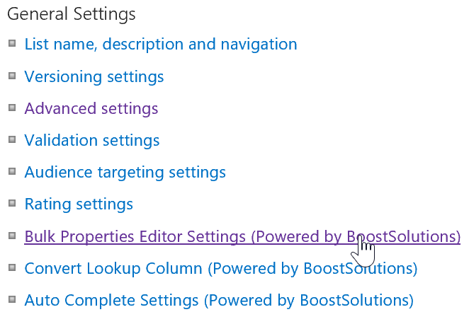 Then, click Bulk Properties Editor Settings (Powered by BoostSolutions) under General section.