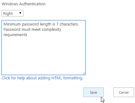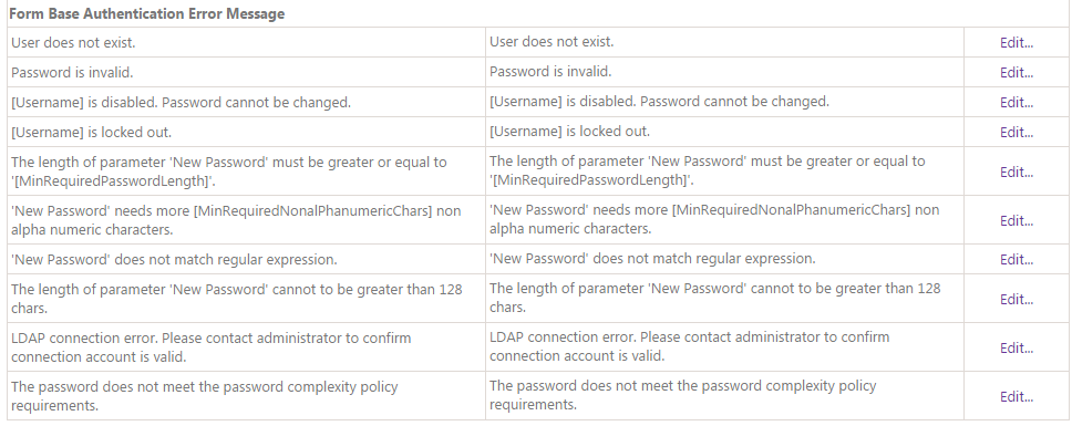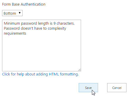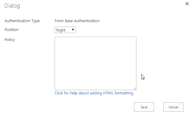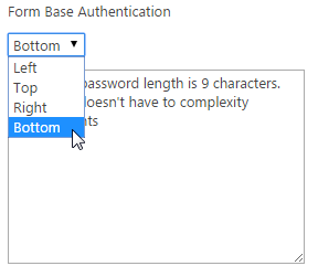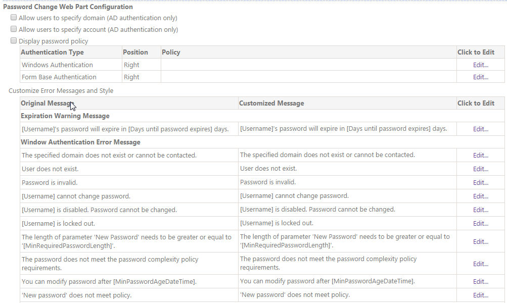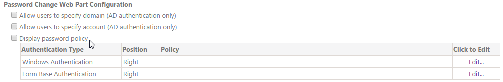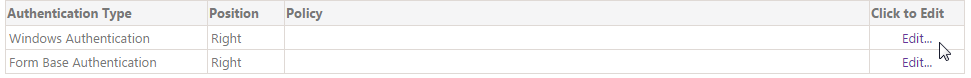 Then, in the Authentication Type table choose which authentication password policy will be displayed. Options are Windows and Form Base Authentication. We can decide in which side of the box to display it and also edit the policy. To do that, we need to click on Edit… button in the end of one of the authentication types.