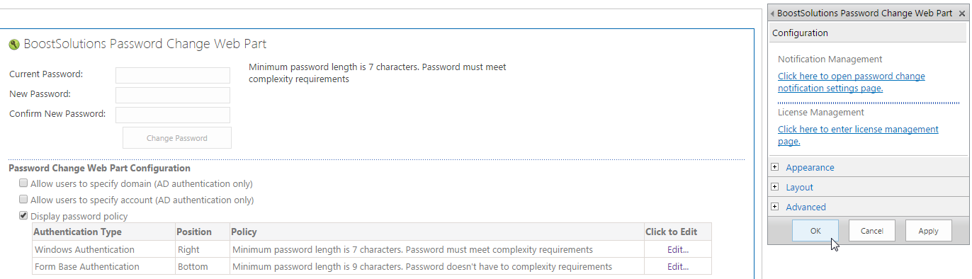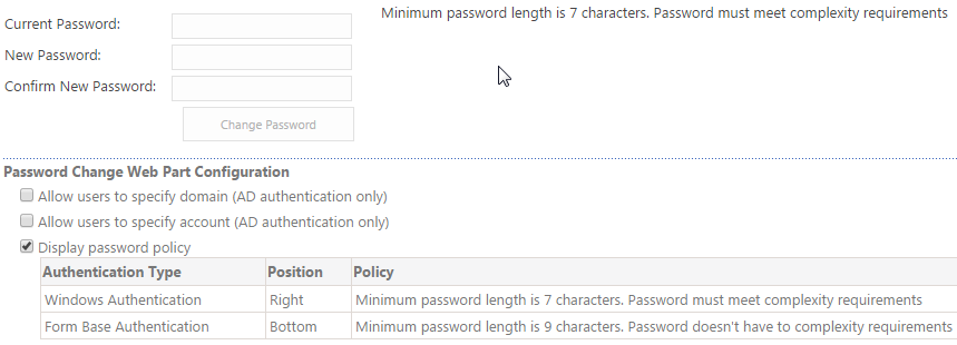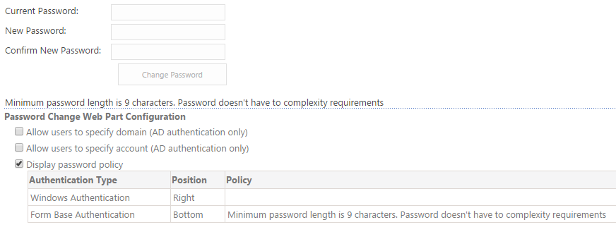 SharePoint Password Change & Expiration allows users to change their own passwords from SharePoint without administrator intervention. When changing the password, it might be helpful for the user to see the Password Policy. After correct configuration of the web part you and other users will be able to see the policy and change the password without any problems. In this article we will show you how to display the Password Policy on the web part.
