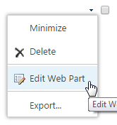 Next step, click on small black triangle on the right side of the web part, next to the check box. After clicking you will see the drop down menu appear.