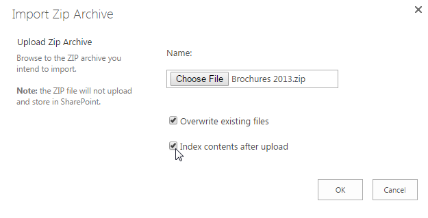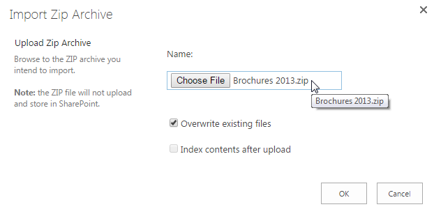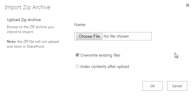 Then, the Import Zip Archive window will pop up. In the Import Zip Archive dialog, click Choose File to browse to the ZIP archive you intend to import. Note that the ZIP file will not upload and store in SharePoint, only the files within the ZIP file will be extracted and uploaded to the document library.
