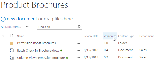 Note that the two existing documents ( Batch Check In_Brochure and Column View Permission Brochure) in Product Brochures are included in the ZIP file Brochures 2013. After extraction, the new extracted Batch Check In_Brochure is under the same path with the existing Batch Check In_Brochure, so the existing Batch Check In_Brochure in the library will be overwritten by the new extracted one (you can see the version of Batch Check In_Brochure has been changed from 0.3 to 0.4). And although the existing document Column View Permission Brochure in Product Brochures is included in the Zip file Brochures 2013 as well, but because Column View Permission Brochure is located in a folder in Brochures 2013, after extraction, the new extracted Column View Permission Brochure (will be located in a folder as it was) is not under the same path as the existing Column View Permission Brochure, so the exiting Column View Permission Brochure will not be overwritten by the new extracted one (you can see the version of Column View Permission Brochure retains as 0.2 after the extraction).