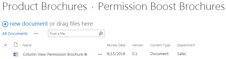 After a short loading process, you will find that all documents (the single WORD document Batch Check In_Brochure and the folder Permission Boost Brochures) contained in the ZIP file ( Brochures 2013) have been extracted and uploaded to the Product Brochures library as following. And the structure of the document is just the same as that in the ZIP file.