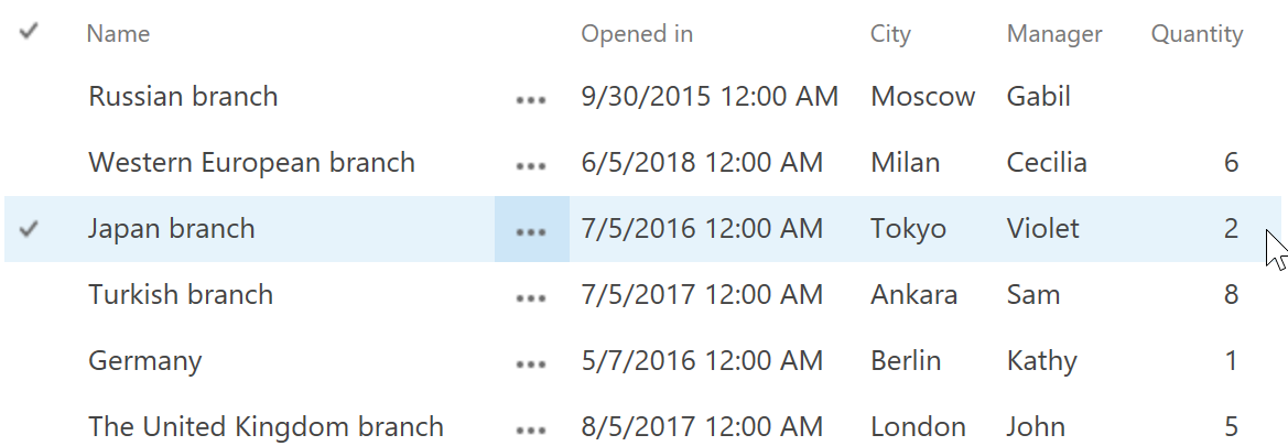 Create a list from the custom list template on a SharePoint site. Here, we created a list named as Branches in which we stored the name of the branch, the time the branch opened in, the city in which the branch is located, the manager who is in charge of the branch and the quantity of the branch. The manager column is a required value column. You can create the list based on your needs.