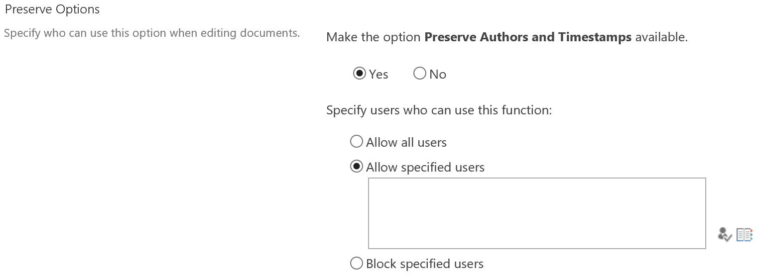 In Preserve Options section, you can specify whether you want to enable the Preserve Authors and Timestamps function and specify which users can use this function when editing documents/lists. Here, let’s first select Yes to make the option Preserve Authors and Timestamps available, then in Specify users who can use this function section, this function to all users in the entire site. Or you can Allow specified users or Block specified users to use this function by entering user/users or SharePoint Group or AD group. Or you can use People Picker or Browse to Select People and Groups. Here, select one of the options under Specify users who can use this function based on your needs. After configuration, click Save to save your change.