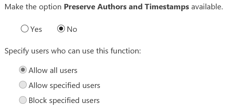 If we select No for Preserve Authors and Timestamps. Then all users/groups will not see the Preserve Authors and Timestamps option on the Bulk Edit/Group Edit/Edit All page in the entire site. It will be invisible and no available to anyone.