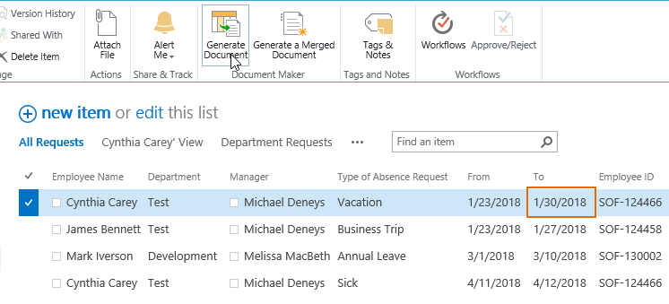 Navigate to Absence Request List, select one item (Cynthia Carey), under ITEMS tab and click Generate Document in Document Maker group.