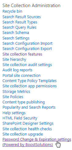 Find Password Change & Expiration settings in the Site Collection Administration group and click on it.