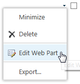 Next step, click on small black triangle on the right side of the web part, next to the check box. After clicking you will see the drop down menu appear. Click on Edit Web Part.