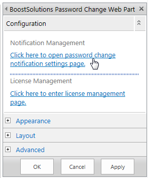 You will see the configuration settings box on the right side of the web part appear. Click on Click here to open password change notification settings page.