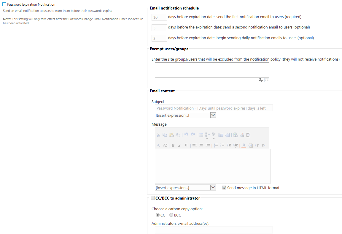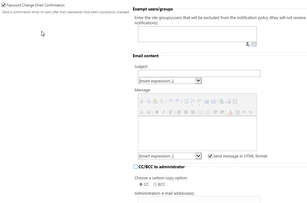 SharePoint Password Change & Expiration allows users to change their own passwords from SharePoint without administrator intervention. This product also has a feature that sends the email confirming the password has been changed. In this article you will learn how to configure the notification email and the day when it will be sent.