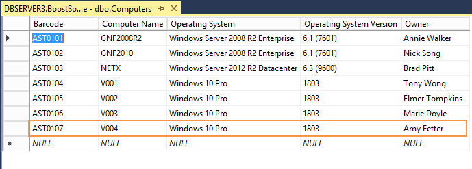 After the job run completely, click Close. In the table Computers in the SQL server database, you will find that the new item AST0107 has been synced to the database as following.